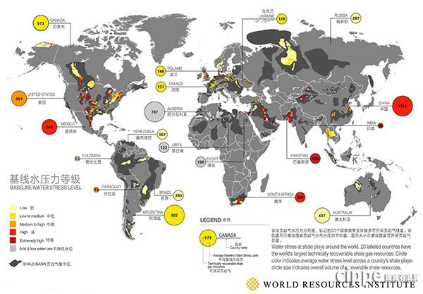 全球页岩气布局,世界20个最多页岩气储量的国家各拥有可开采页岩气总量及其基线水压力图示