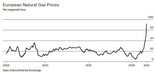 截止到上个月,欧洲的天然气价格已经飙升至一年前的4.6倍。
