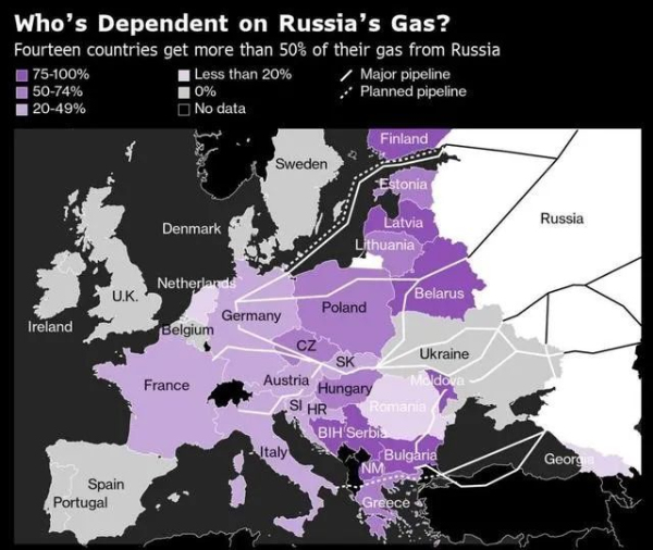 (示意图:欧洲各国对俄罗斯天然气的依赖,颜色越深,依赖度越高)