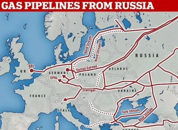(俄罗斯向欧洲输送天然气的管道,分为陆上管道和海底管道)